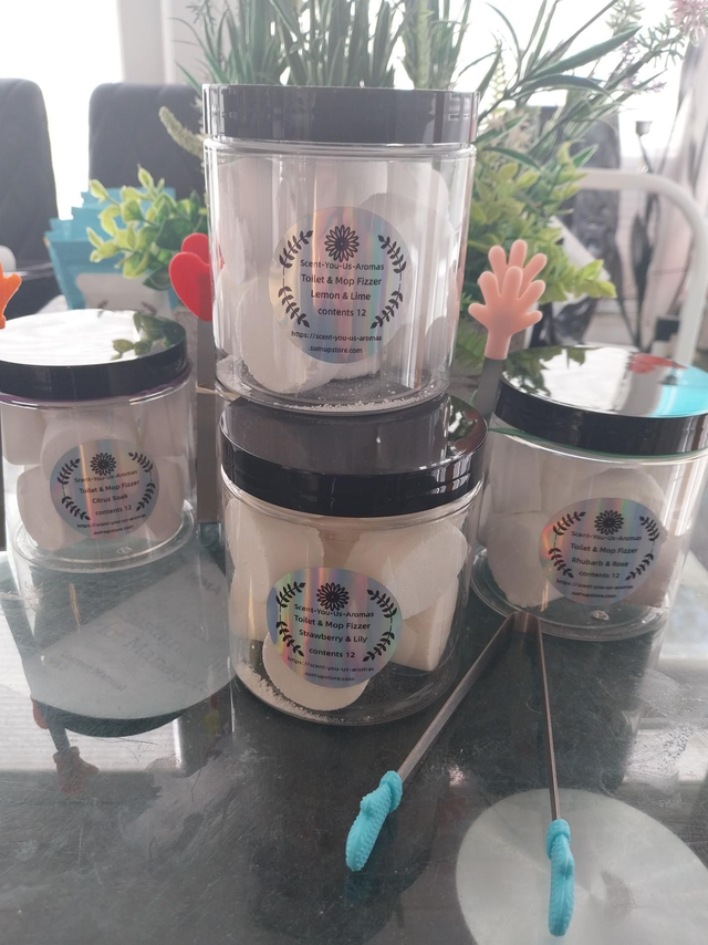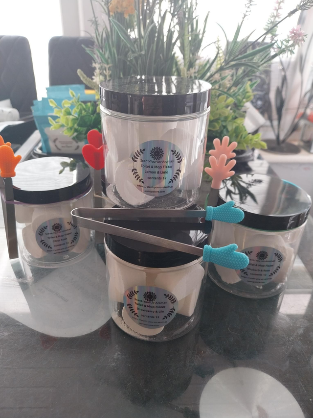 Toilet & mop fizzer Jar of 12 cubes. Drop one into your toilet or mop bucket every few days to keep them fresh and clean. Comes complete with a cute pair of tongs, colour may vary.